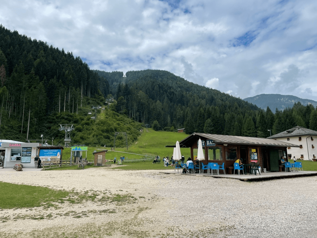 We besloten een stukje te gaan lopen langs de rand van het meer. Je kunt helemaal rond! Toen we even onderweg waren zagen we en bordje staan met daarop 🐄 Malga Foresta 1,5 km. Dit is een bergweide waar de koeien grazen en een heerlijk terras met berghut bij was. We zijn hier naar toe gelopen en hebben hier heerlijk wat gegeten en gedronken.