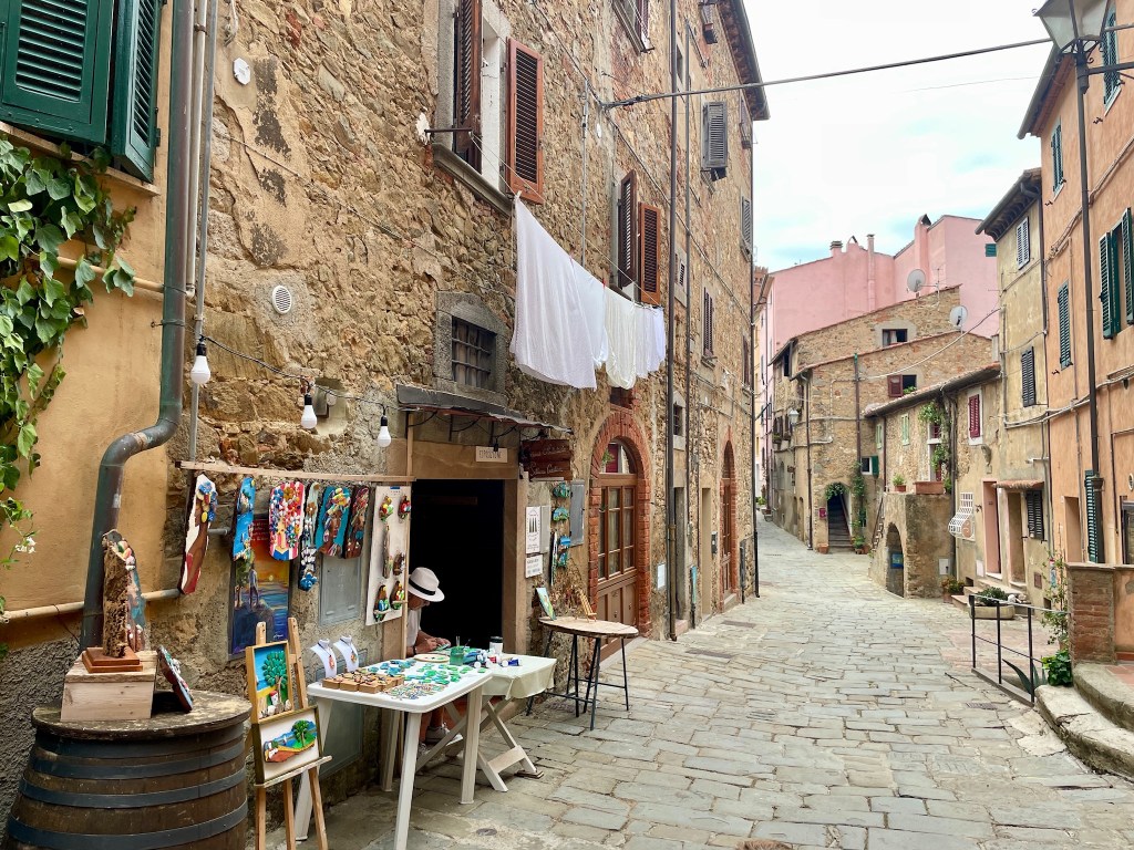 Vanuit onze camping was dit ongeveer 25 minuten rijden. We kwamen aan en vonden een geschikte gratis parkeerplek 🅿 Parkeerplek Campiglia Marittima. Daarna liepen we bergop richting het dorp, dat hoog op een heuvel ligt. We slenterden door wat smalle straatjes met oude stenen huizen, ontdekten gezellige pleintjes en lokale winkeltjes en genoten van het uitzicht over de Toscaanse heuvels.